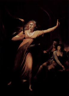 The Sleepwalking Lady MacBeth, by Johann Heinrich Füssli. The scene: she charges through the room, while the Doctor and the Gentlewoman look on, bewildered.
